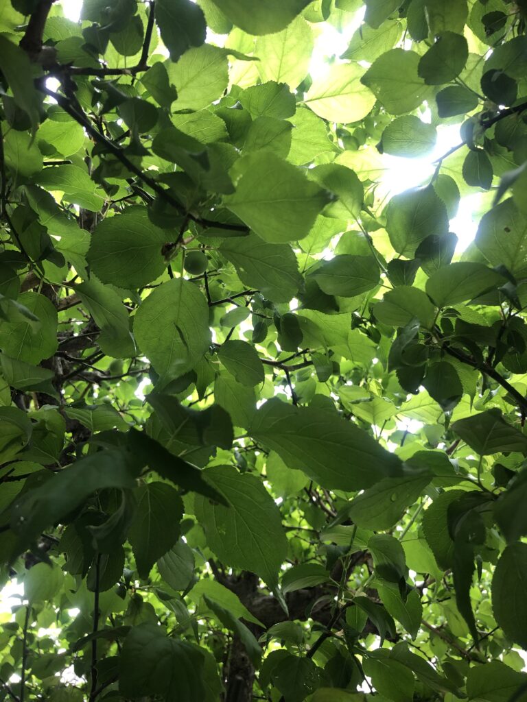 新緑の季節です。濃淡のある緑が、とってもきれいです。若葉もみるみる大きく開いてきていて、おひさまをたっぷりとりこんでいます。目を凝らして見ると、実も少しづつ大きくなってきています。梅子、グッジョブ。