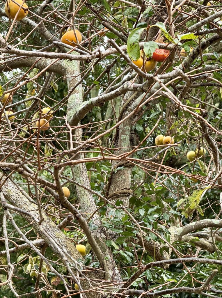 仕入れ道中にある、秋の確認処であり、鳥たちのお食事処の柿の木食堂です。実は熟すと落ちますが、樹上でも地上でも、ツンツンつっついている鳥を見る事もあります。「ようやく秋だねぇ」「そうだねぇ」というおしゃべりも聞こえてきそうです。