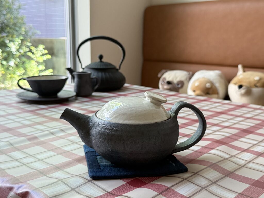 糸島の「うつわと手仕事の店 研」さんに、ティーポットを仕立てていただきました。可愛らしいころんとしたかたち、落ち着いたモノトーンの色合い、リーフがのびのび踊れる、深くて広い内網を備えています。ティーカップとミルクピッチャーは先行して入店しており、これにてお茶をお楽しみいただける一揃いです。ティーポットには2杯程度の茶葉(もしくはティーパック)と、鉄瓶で沸かしたお湯を入れ、目安となる砂時計も一緒にお出しします。