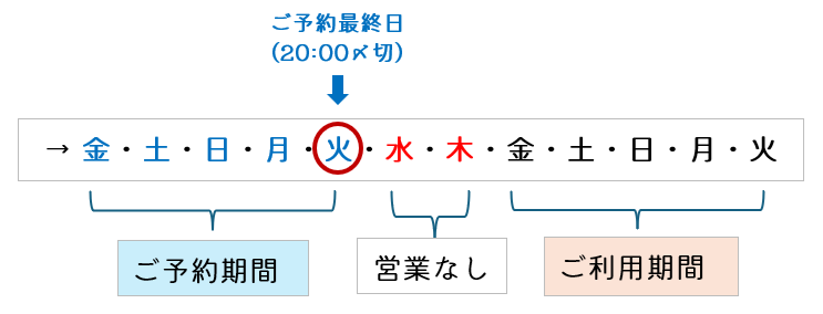 ※ 毎週火曜が次の金曜から火曜までのご予約締め切りです。