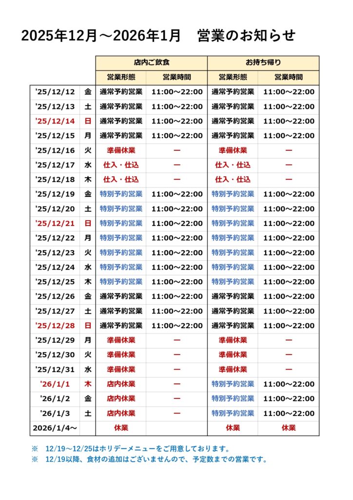 下記添付の通り、12月中旬~1月中旬までは、変則スケジュールです。ご予約方法に変更はございません。実際の営業状況は、cafe gran(店内ご飲食 詳しくはコチラ)「おうちでぐらん」(おもちかえり 詳しくはコチラ)のページをご覧ください。